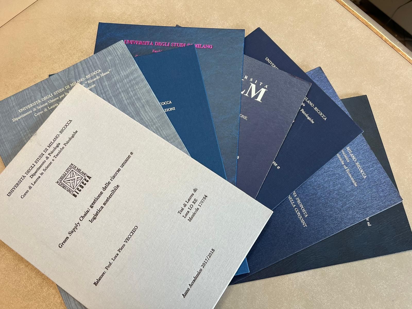 Nome, titolo, logo dell’università o un tocco grafico originale? Stampiamo qualsiasi scrita o simbolo direttamente sulla copertina, con qualità tipografica superiore.